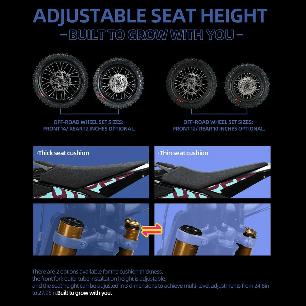 Disclaimer: All electric dirtbikes sold by FactoryZ are intended for off-road use only, unless otherwise noted. It is the buyer’s responsibility to comply with all local, state, and federal laws regarding the use of these vehicles. FactoryZ is not liable for any misuse, accidents, injuries, or damages resulting from the operation of these vehicles. Ride responsibly and always wear proper safety gear.